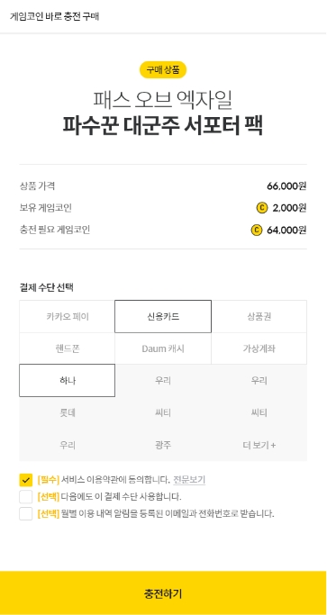 원하는 금액만큼 금액을 입력하고 결제 수단만 선택하면 충전 완료!